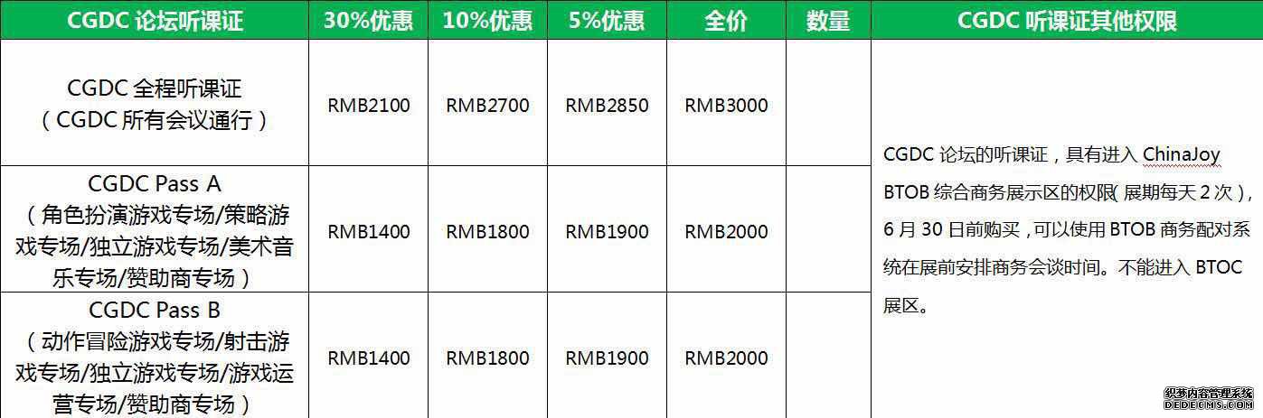 与BTOC展区不同,参加BTOB综合商务洽谈区或各种同期会议均需购买或申请相应的专业观众证和听课证。为了回馈早期购买证件的业内各界人士,ChinaJoy主办方汉威公司与往年一样,特别为相关证件的购买设置了不同时段的优惠期,具体活动时间及证件优惠幅度如下(以下优惠期时间以付款时间为准):