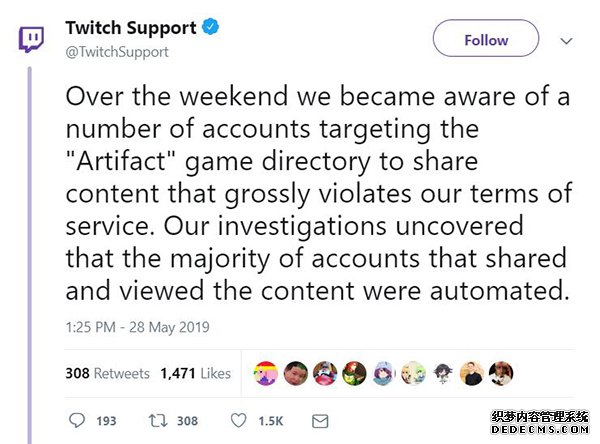 Twitch在公告中表示,官方对上周末《Artifact》发生的异常有了解。大量钓鱼号在该频道下“分享严重违反我们(Twitch)规定的内容”。大部分直播账号的分享和观看都是机器人自动生成的。